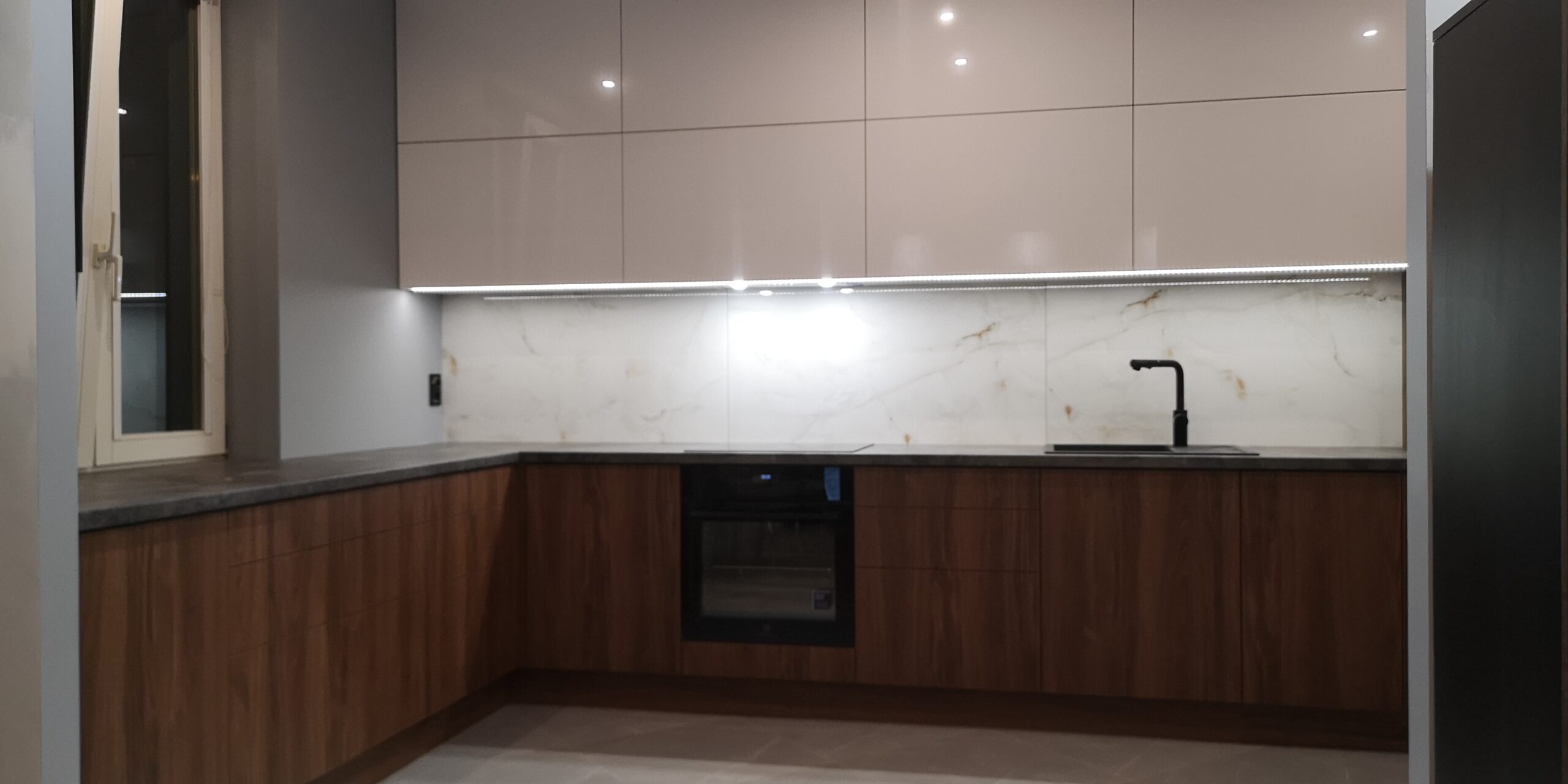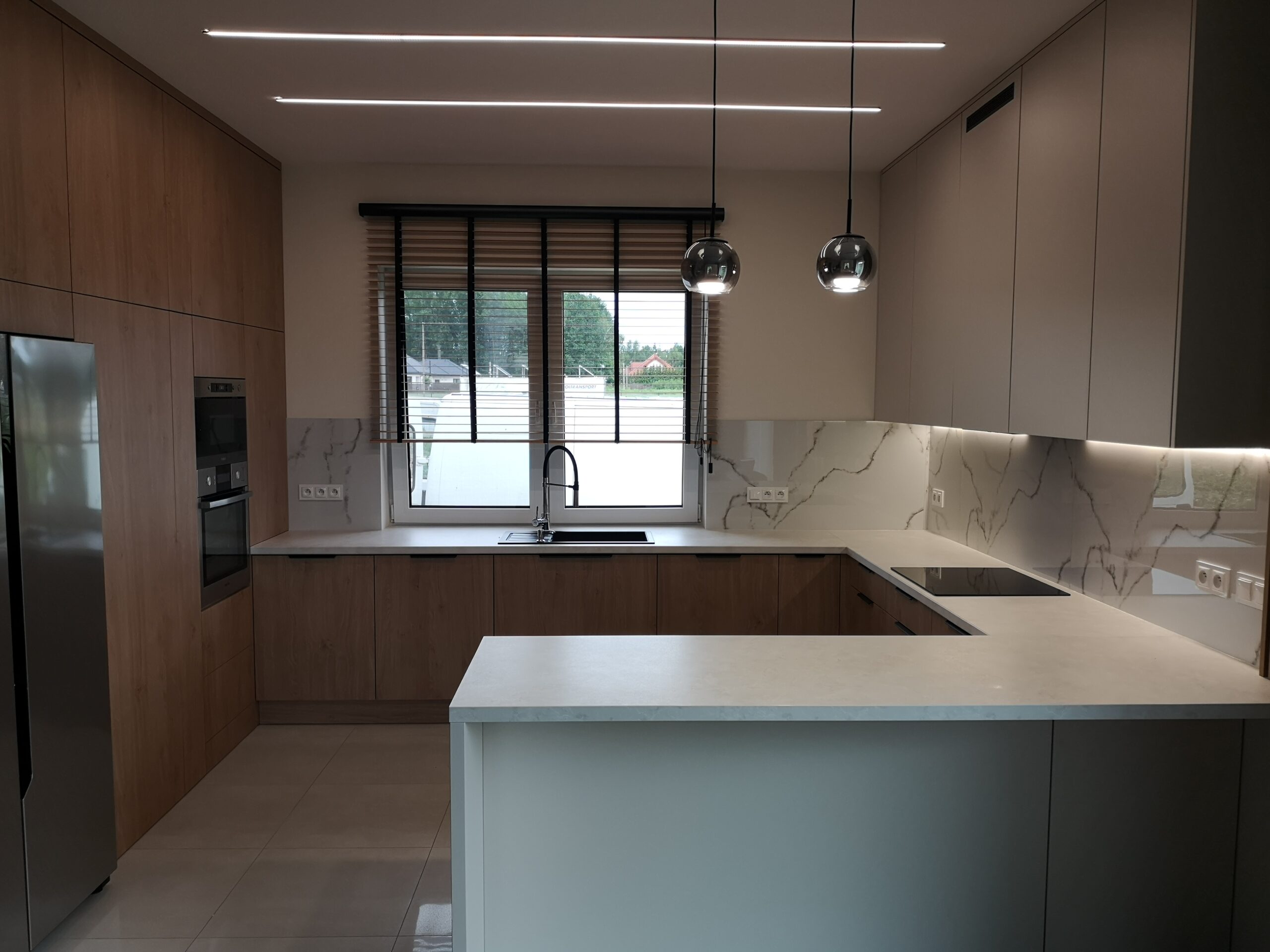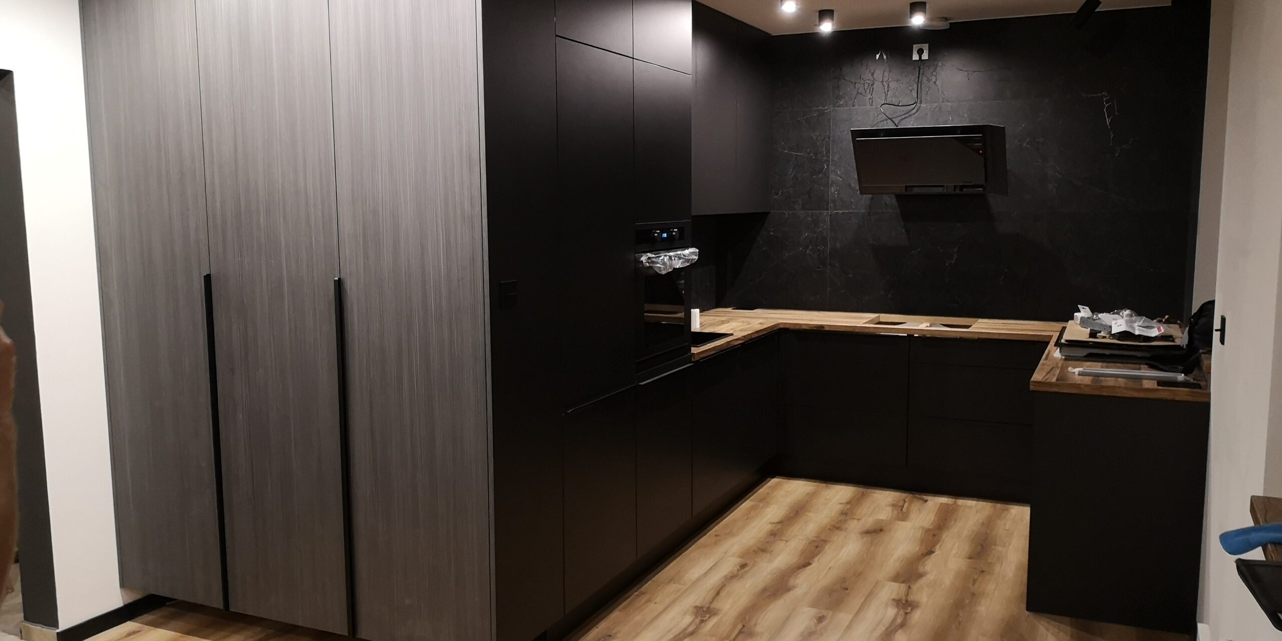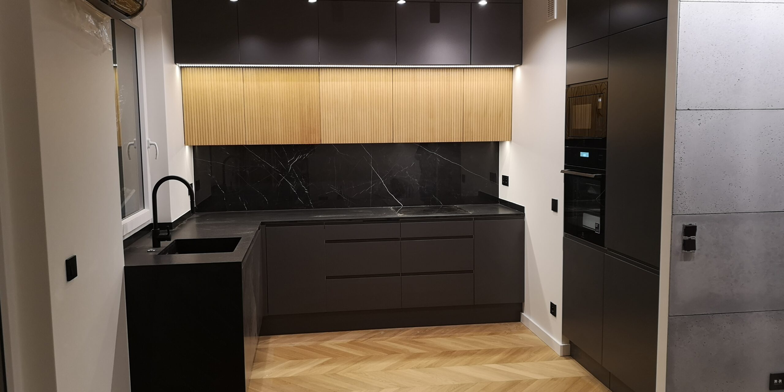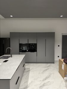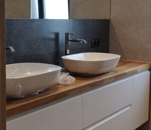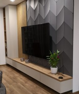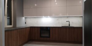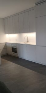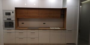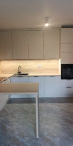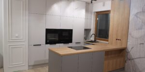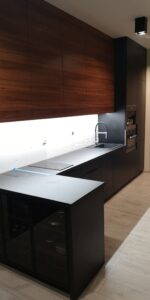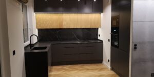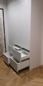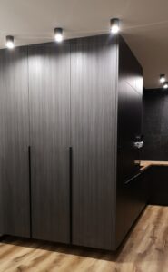 W naszych realizacjach stosujemy rozwiązania marki Blum – okucia meblowe, które gwarantują płynne domykanie frontów oraz wysoką trwałość. Ponadto, korpusy wykonane są z płyt Kronospan – płyty meblowe, bardzo odpornych i estetycznych.