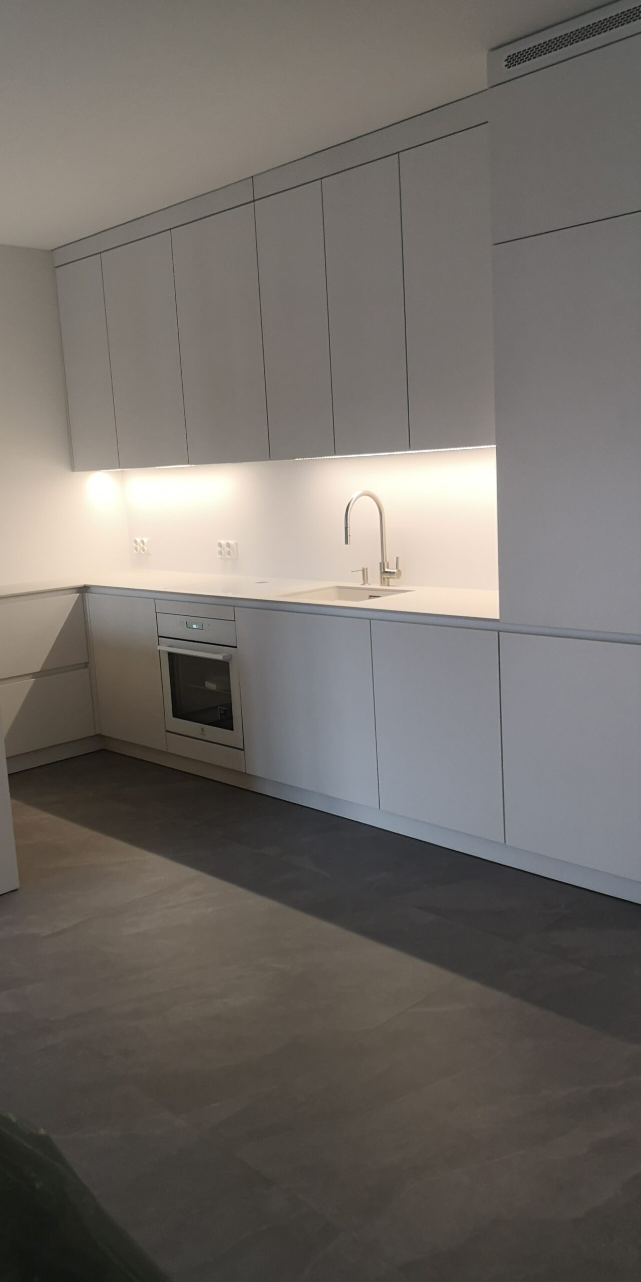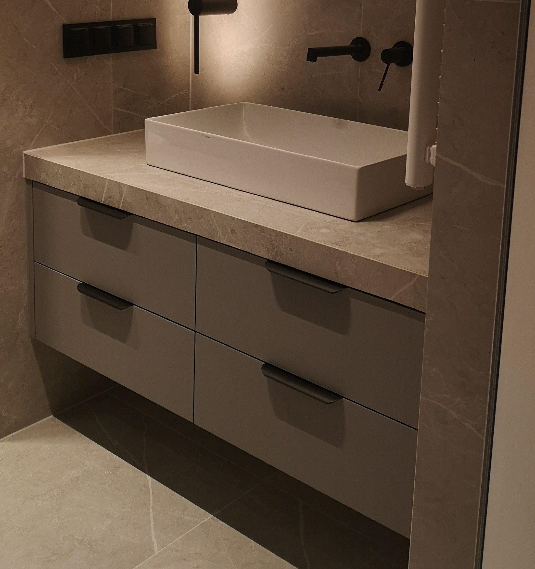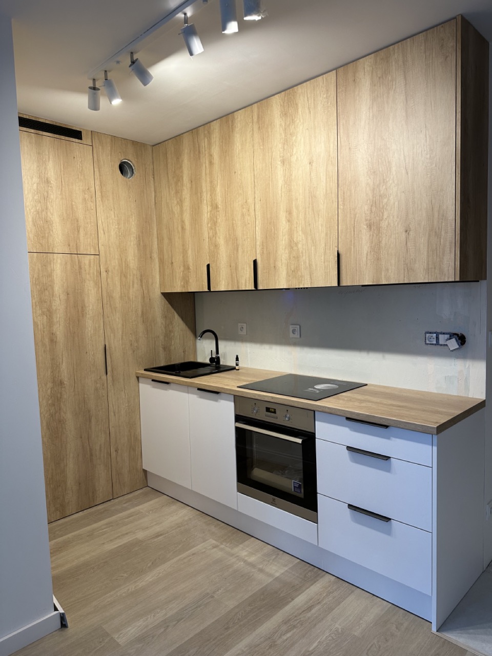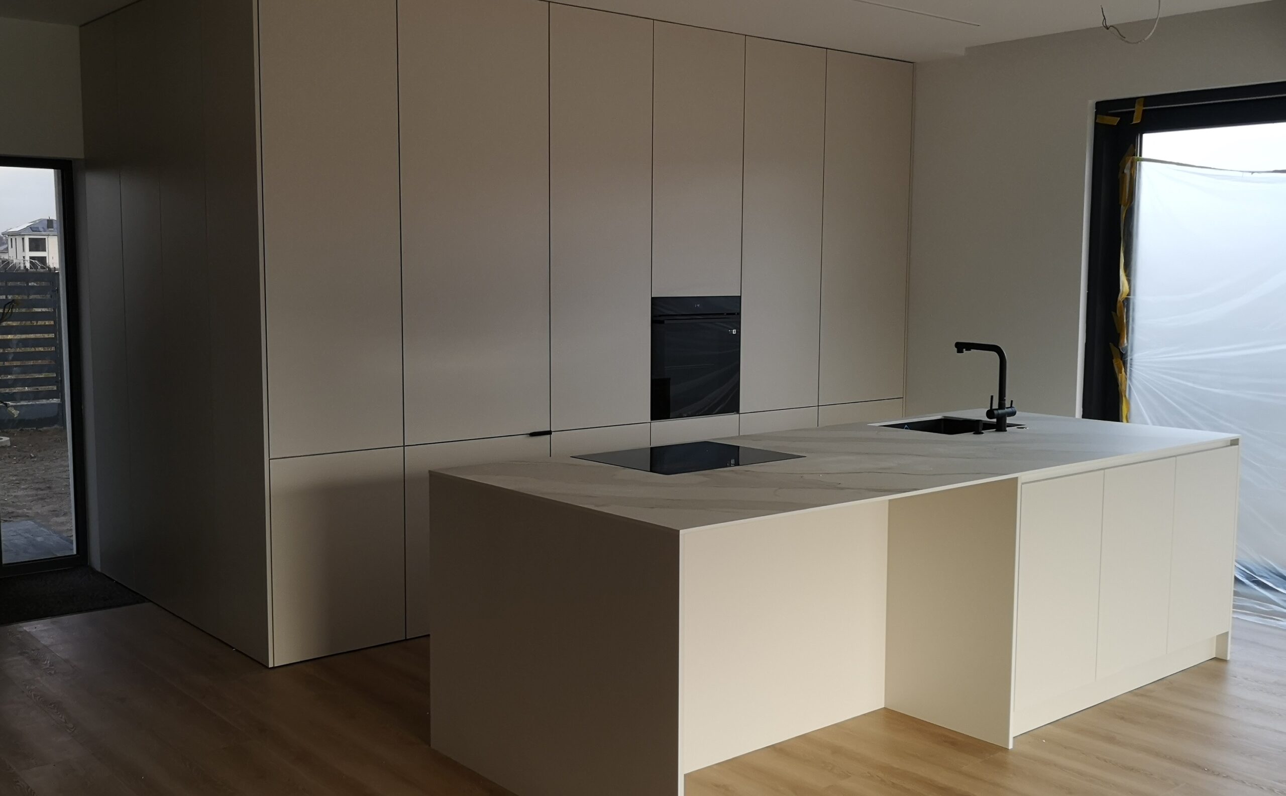 W naszych realizacjach stosujemy rozwiązania marki Blum – okucia meblowe, które gwarantują płynne domykanie frontów oraz wysoką trwałość. Ponadto, korpusy wykonane są z płyt Kronospan – płyty meblowe, bardzo odpornych i estetycznych.
